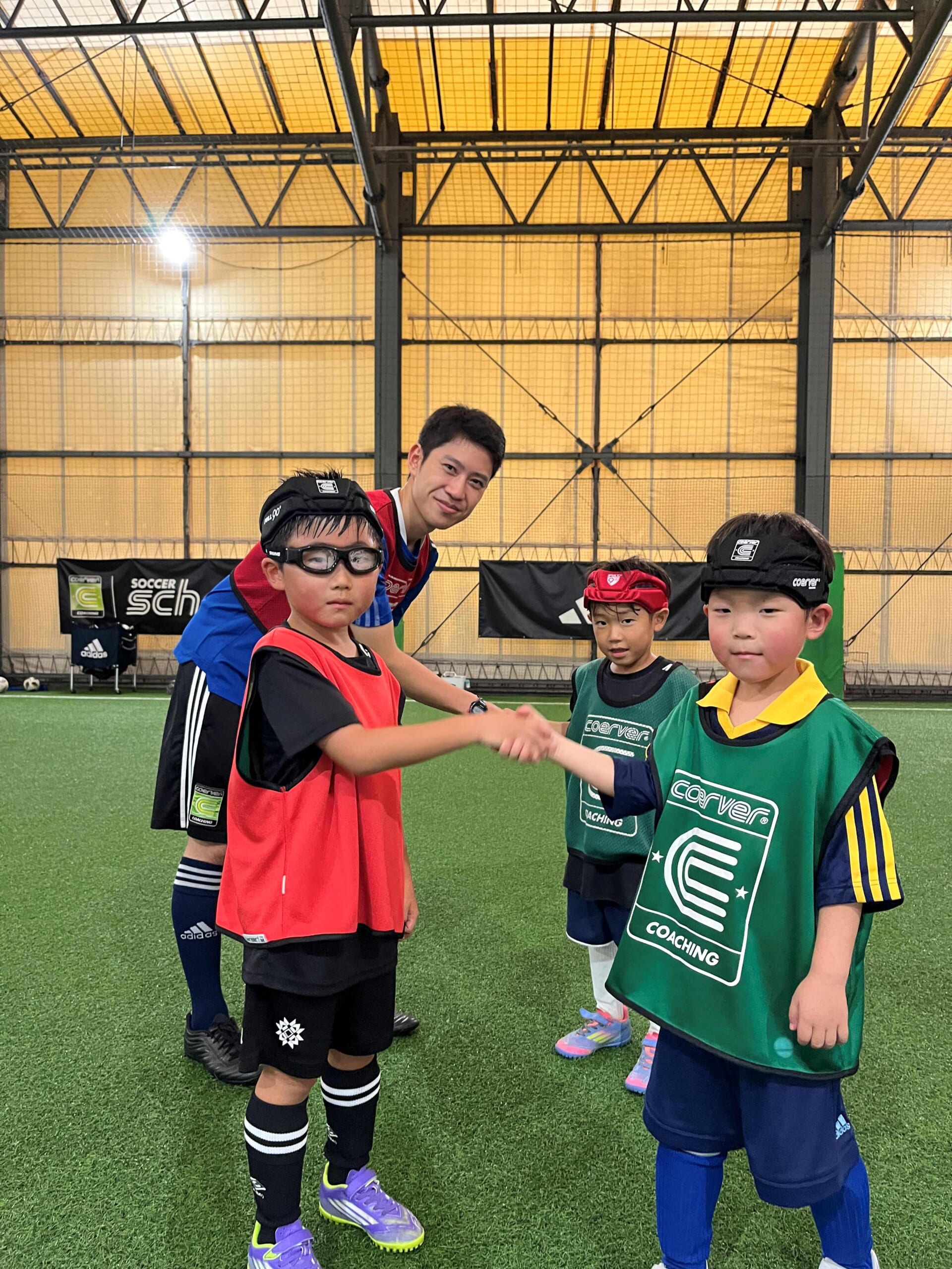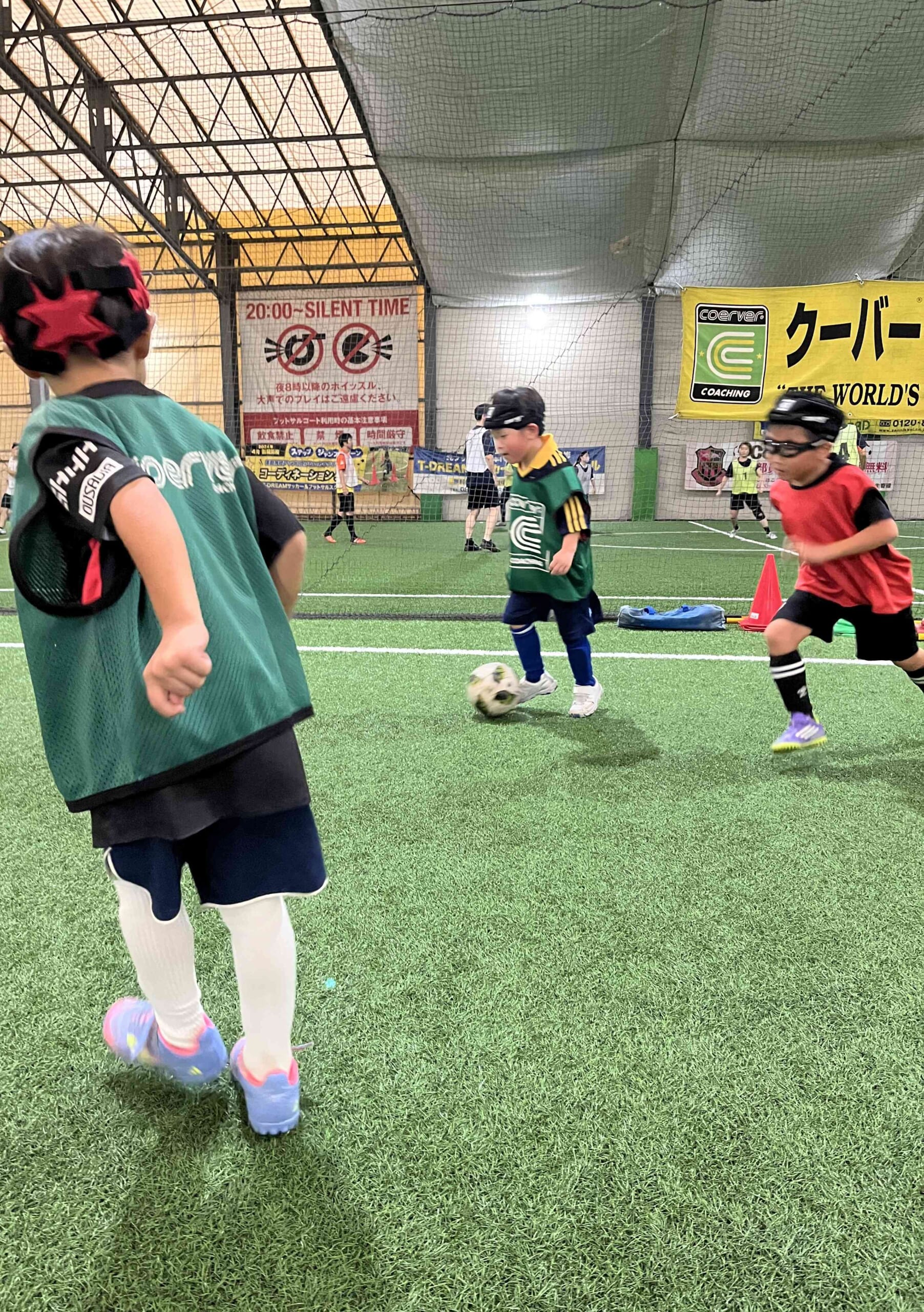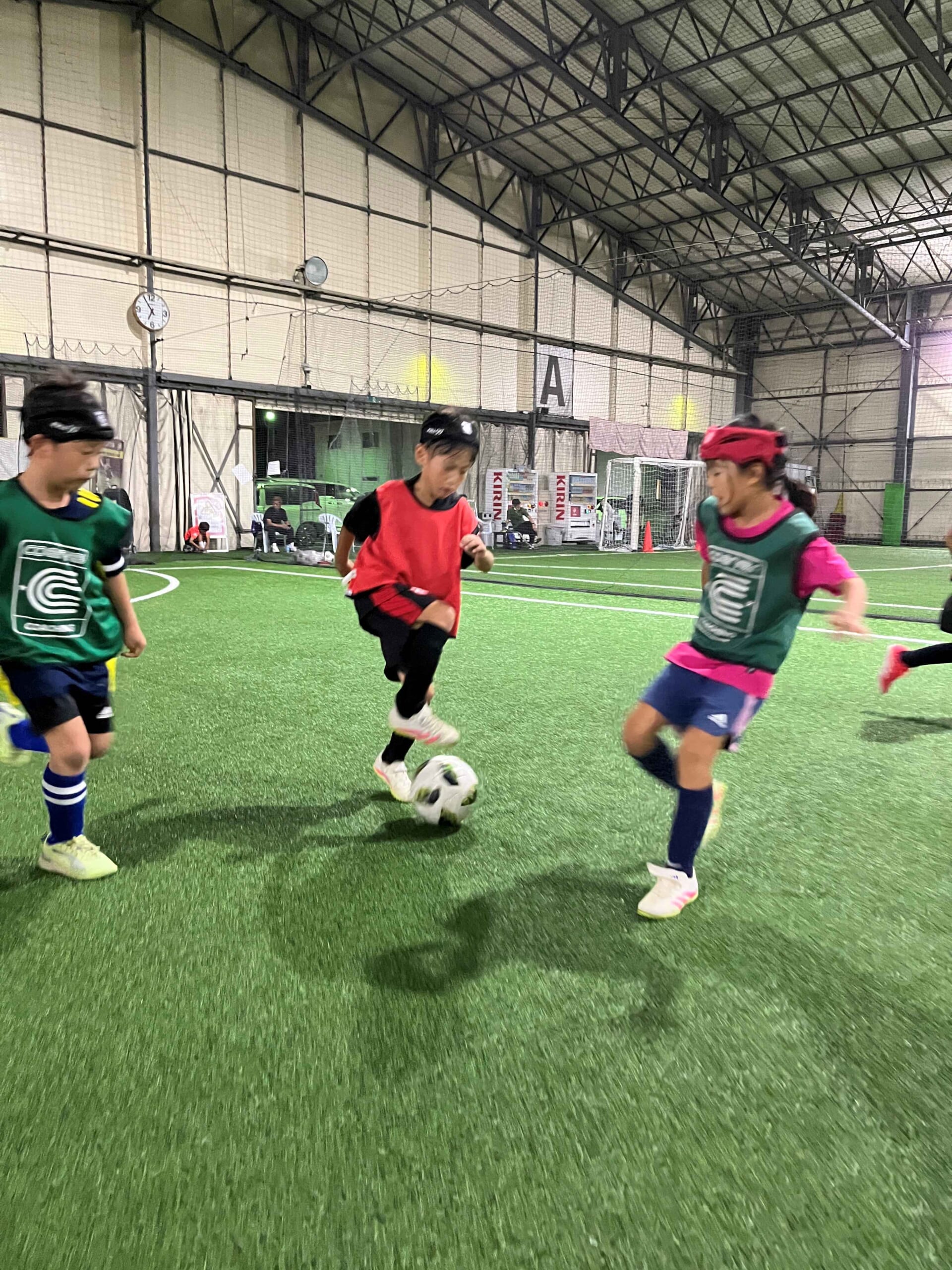 普段のスクールでも必ず1v1の練習を行いますが、今回は1v1のテクニックを「いつ、どのエリアで、どのように」を細かく時間をかけてトレーニングを行いました。反復することで形を覚えていき、緩急をつけたドリブルから仕掛けることができるようになり、ゲームでチャレンジする姿も何度か見られました。是非、得意なフェイントの一つになってほしいと思います。