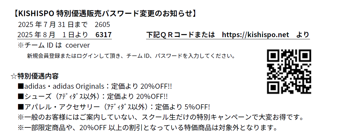 KISHISPO オンラインショップ 特別優遇販売パスワード変更のご案内