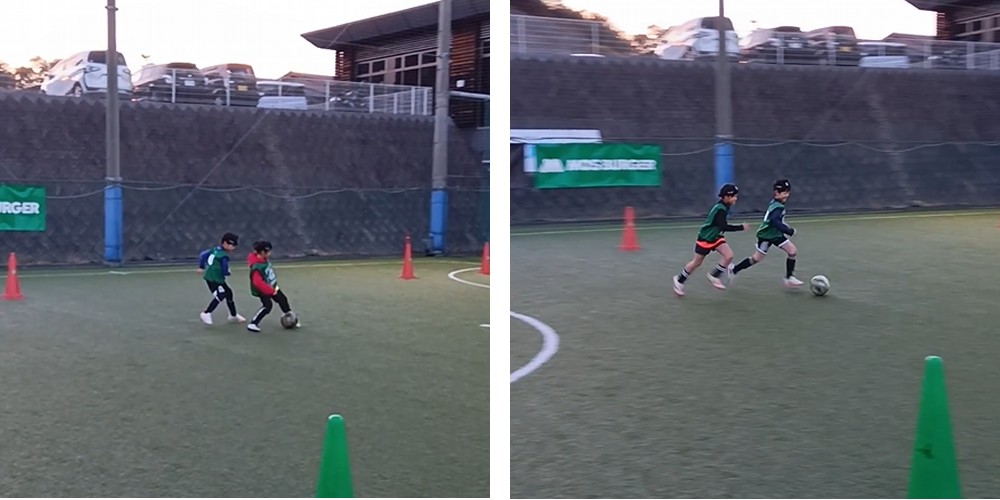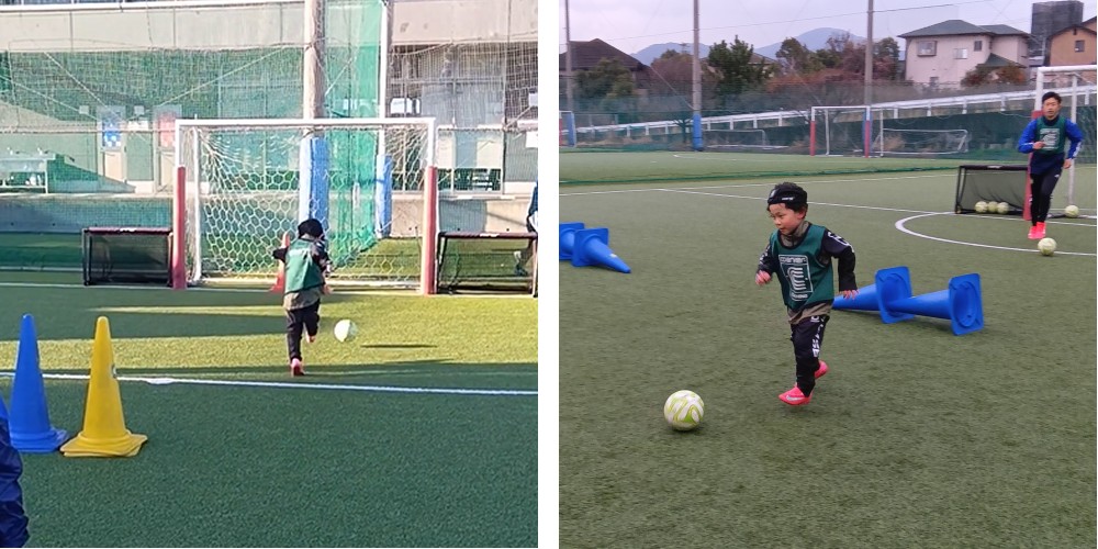 ドリブルでは、ボールが足から離れすぎないように、やさしく触る感覚を少しずつつかんできました。コントロールが安定してきたことで、最後のシュートまでつなげられる場面も増え、決まった瞬間の嬉しそうな表情がとても印象的でした!