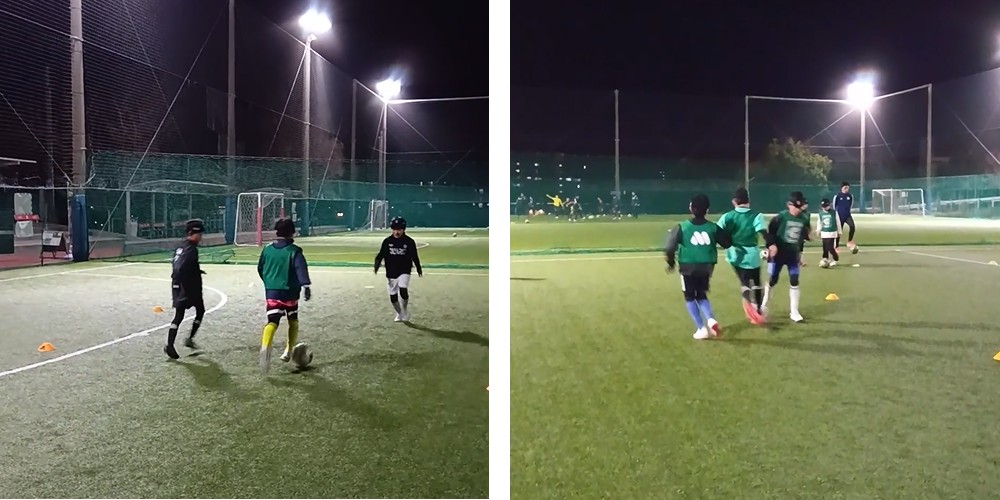 1対1でゴールが2つあるメニューでは、相手の動きをよく観察しながら、急にスピードを上げたり、あえて止まったりすることで、見事に相手をかわしてゴールを決める場面がたくさん見られました!