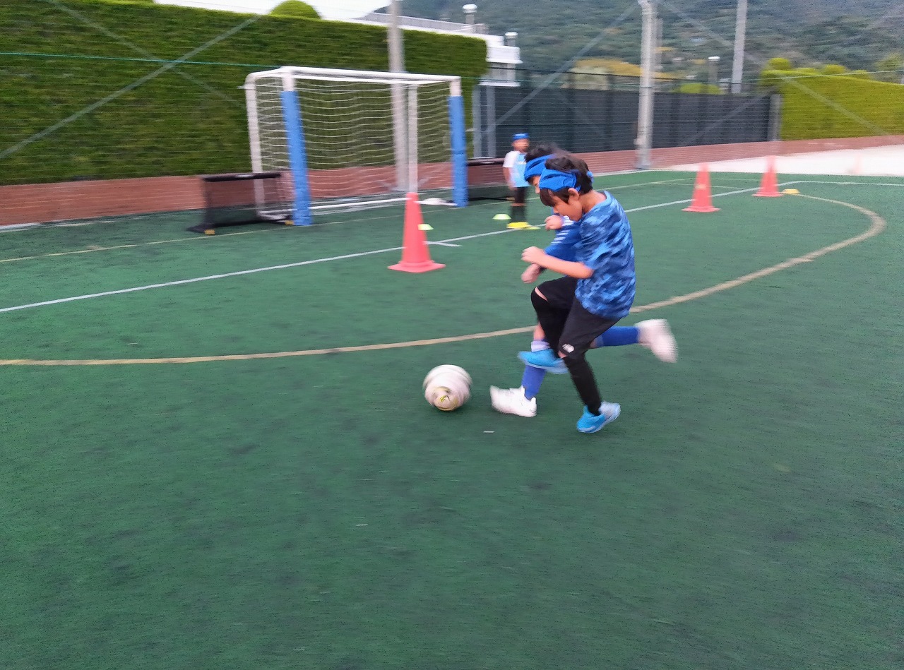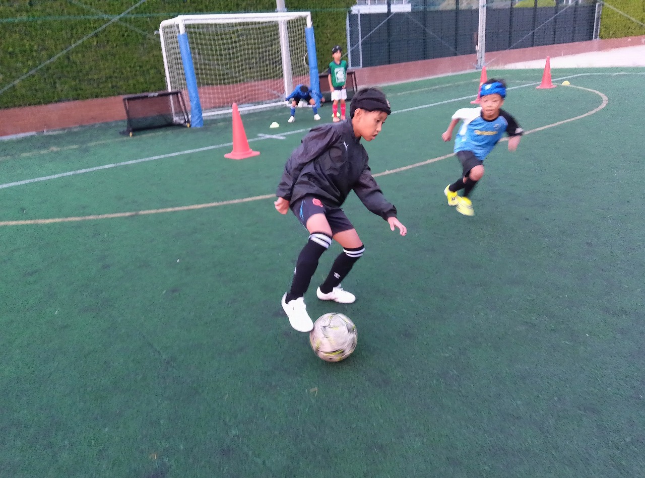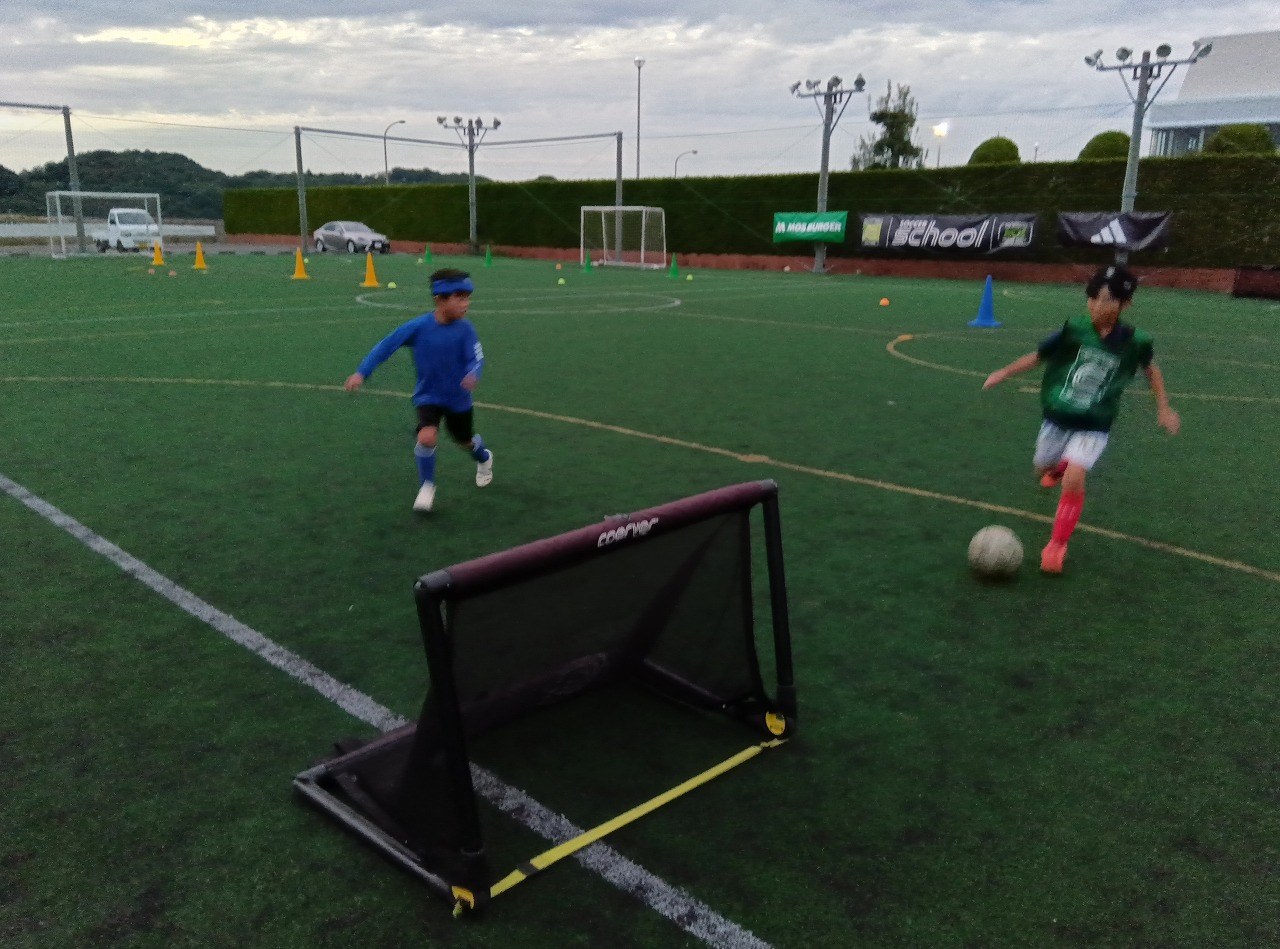 U-9クラスは相手が前にいる時に使えるフェイントのムーブスの反復を行いました。その後は実際に1対1を実施し、相手の左右どちらにもボールを運べる持ち方から縦突破orカットインのプレーやゲームの中で積極的にチャレンジする場面が多く見られました。