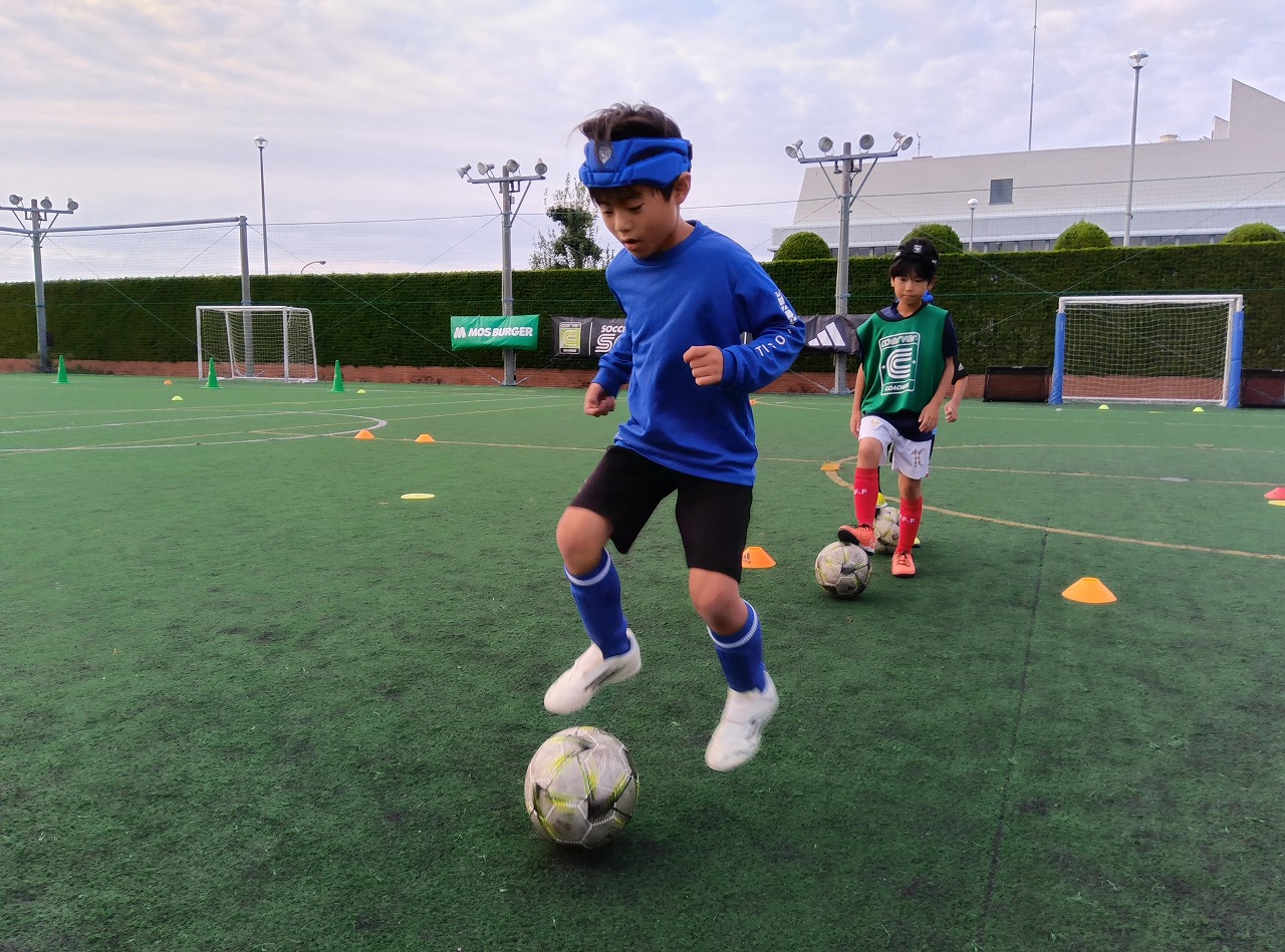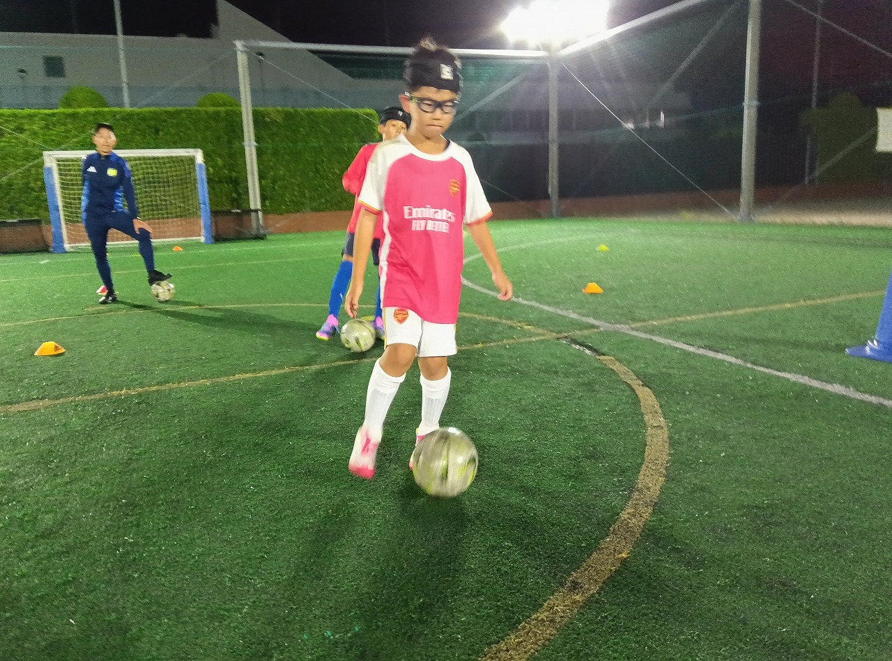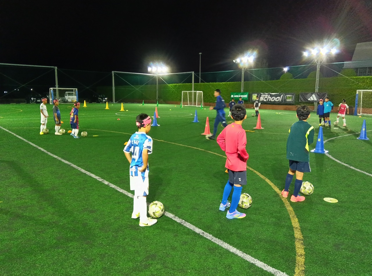 U-9クラスは相手が前にいる時に使えるフェイントのムーブスの反復を行いました。その後は実際に1対1を実施し、相手の左右どちらにもボールを運べる持ち方から縦突破orカットインのプレーやゲームの中で積極的にチャレンジする場面が多く見られました。