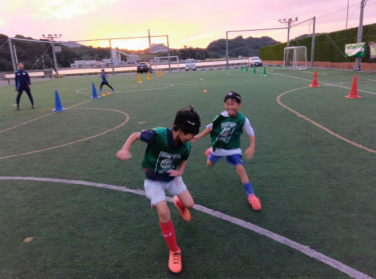 U-12クラスは仕掛け方と突破・逆を取るドリブルのバリエーションを増やしていきました。縦突破からの正確なクロスやカットインからゴールを決めるプレーやチャレンジする姿勢が見られました。今後もひとりひとりが上達でき、自信を持てるようなイベントを開催していきたいと思います。