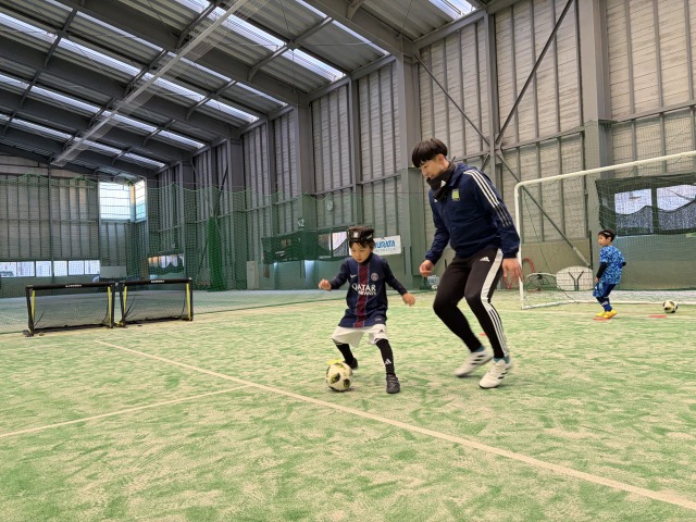 また、パスの練習にも挑戦!コーチをディフェンスに見立てて、コーチのいない方向へパスを出すことを意識しました。その結果、ゲーム中も逆サイドの仲間にパスを出せるようになり、大きな成長が見られました。自分でドリブルするか、仲間にパスをするか、状況を見て判断する楽しさを感じ始めています。