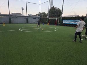 1人目の参加者はサイドでの突破をトレーニングテーマに選んでいただきトレーニングを行いました。突破=ドリブルという視点ではなく、クロスボールを選択肢に持ち続ける中で縦と中の駆け引きのアイデアを引き出していきました。トレーニングを進めるうちにクロスボールの質が上がり、だからこそ相手との駆け引きで選択肢が増え、結果コーチとの1v1でも打開できるシーンが増えていました。選択肢が増えたことで1つ1つのプレーに余裕が生まれプレーの質がとても向上されました。