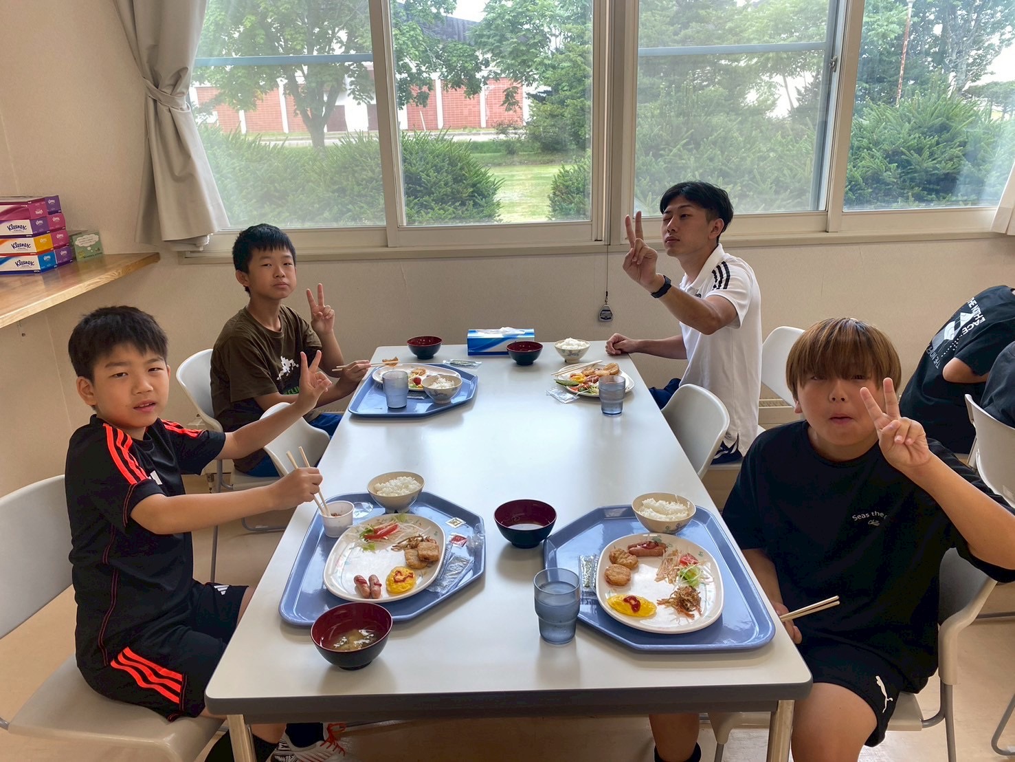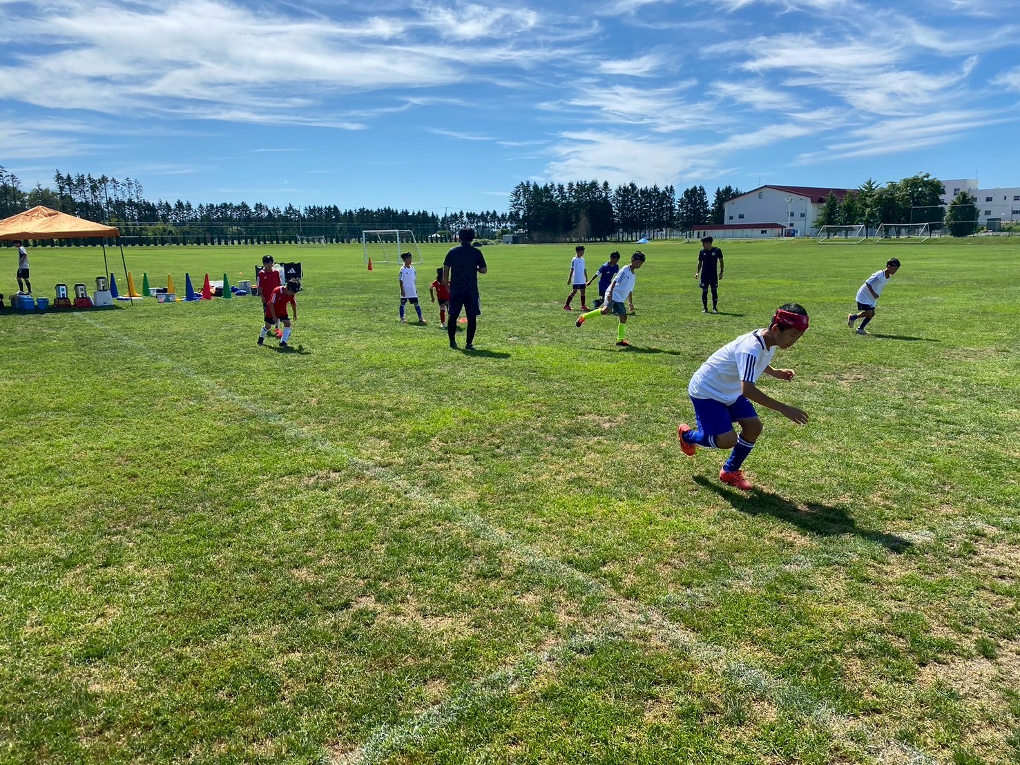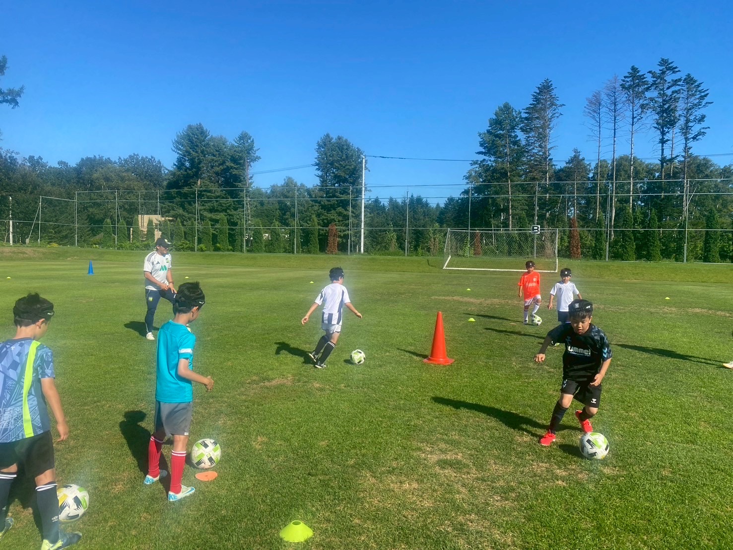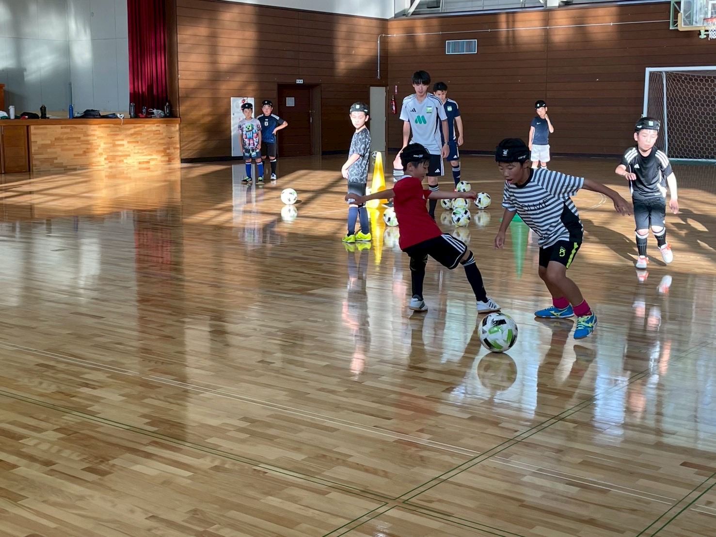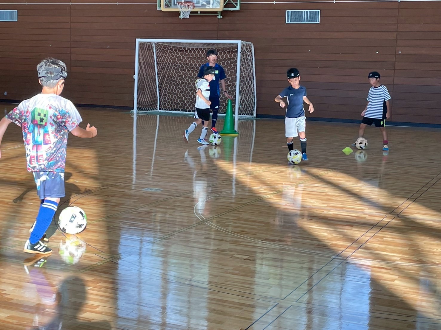 1日目はバスに乗り到着後、体育館でのトレーニングとなりました。アイスブレイクで参加した選手達とコーチ達でコミュニケーションを取り、楽しく行うことができました。その後は1v1のフェイントをテーマとしてトレーニングし、相手の立ち位置によって縦に突破かついてきたら中にカットインかをドリブルしながら選び、判断して突破する選手が多く見られました。ガイダンスは施設での注意事項の説明やサマーキャンプでの目標を立て、その目標を達成できるように気持ちを作ることができました。