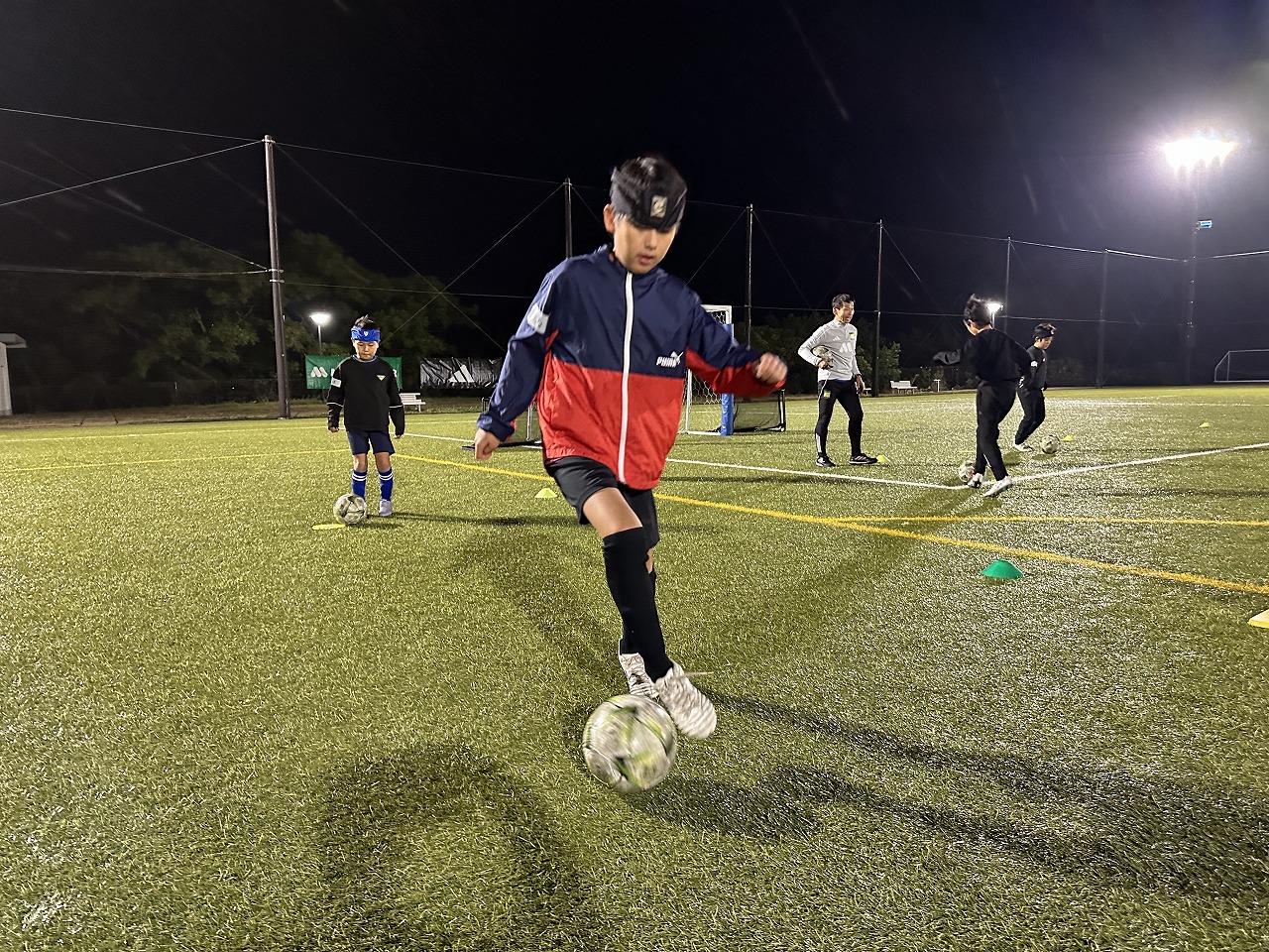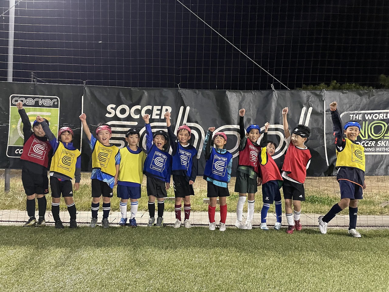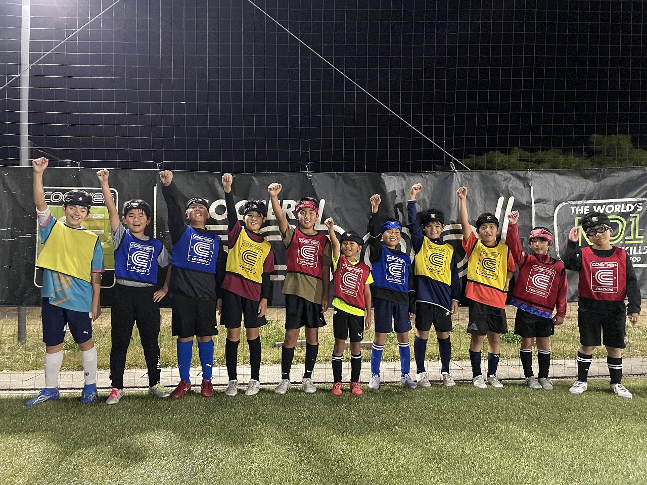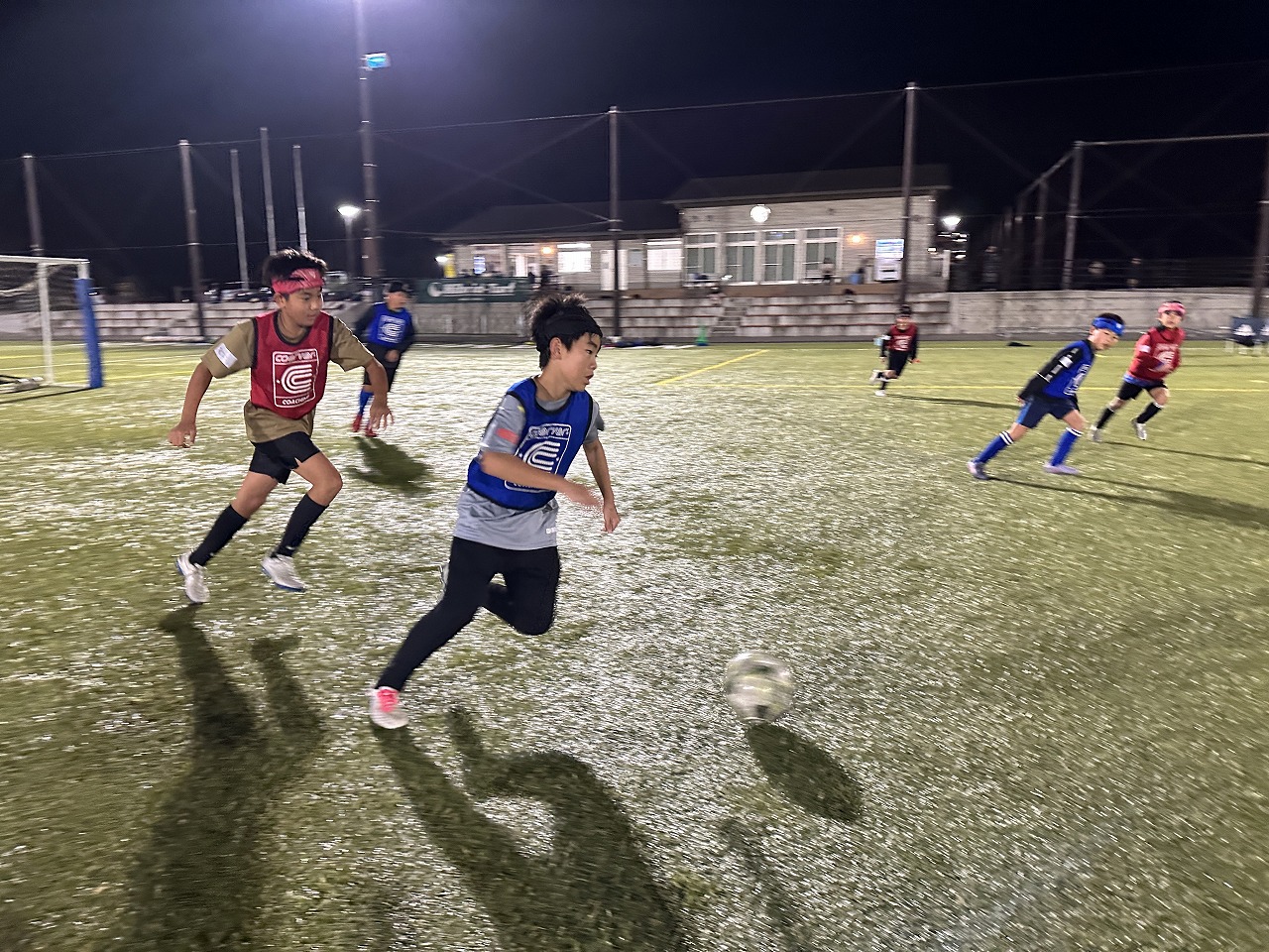 トレーニングでは、クーバー独自のボールマスタリーを中心としたウォーミングアップや競争形式のボール集めゲームなどで仲間たちと打ち解けていきました。相手が横や後ろにいる時に使えるターンのムーブスの反復を行い、その後は実際に1対1を実施し、前を向く、向かない認知・判断を促していきました。前を向いて仕掛けることやシールディングを使って保持に変えるなど状況に応じたテクニックを実行することができていました。最後のミニゲームでは空いているレーンを仲間全員が意識しながらプレーすることができ、成果が見られたイベントでした。