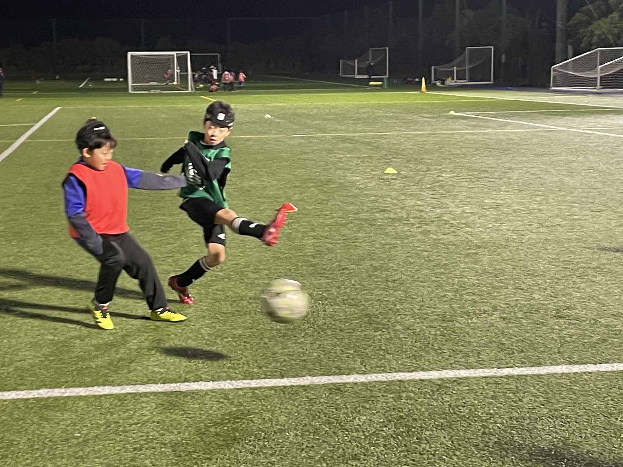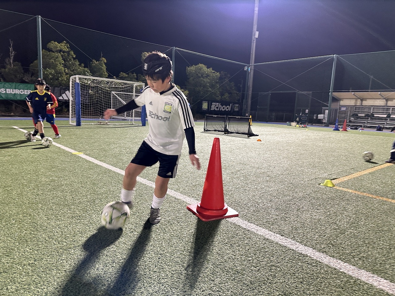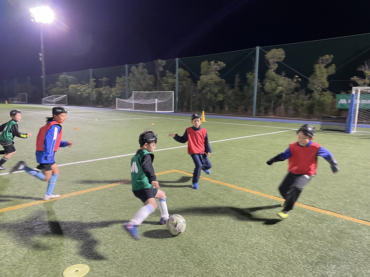 | 10月 | 「1v1攻撃 ~フェイント~(シザーズ・ダブルシザーズ・シザーズドラッグ)」 相手が前にいる時のフェイントを覚えて、相手を突破することを練習しました。突破からシュートを狙ったり、チャンスを広げたり、フェイントの後のアイズアップや緩急も実践したことで、1対1やミニゲーム時にたくさんのチャレンジが見られ、トライ&エラーを繰り返しながら少しずつ自信を持つ選手が増えてきた印象です。 |