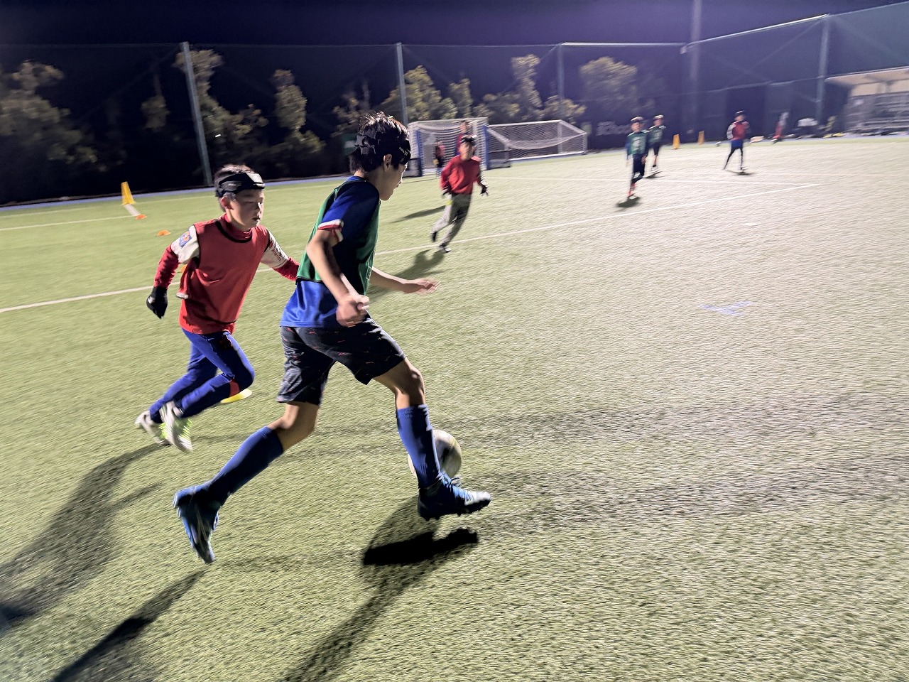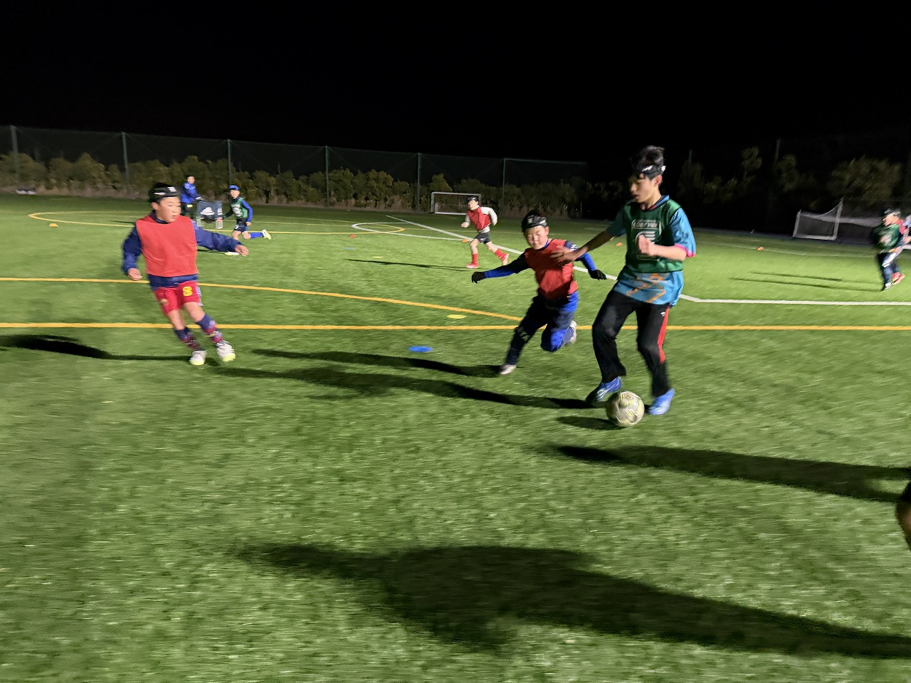 相手が横にいる状況を想定し、ボールを失わないためのシールディングからターンするように見せるストップ&スタートのムーブスを練習しました。しっかり相手からボールを隠しながら使うことで相手のプレッシャーが強い場面でも保持し、突破する場面が多く見られました。